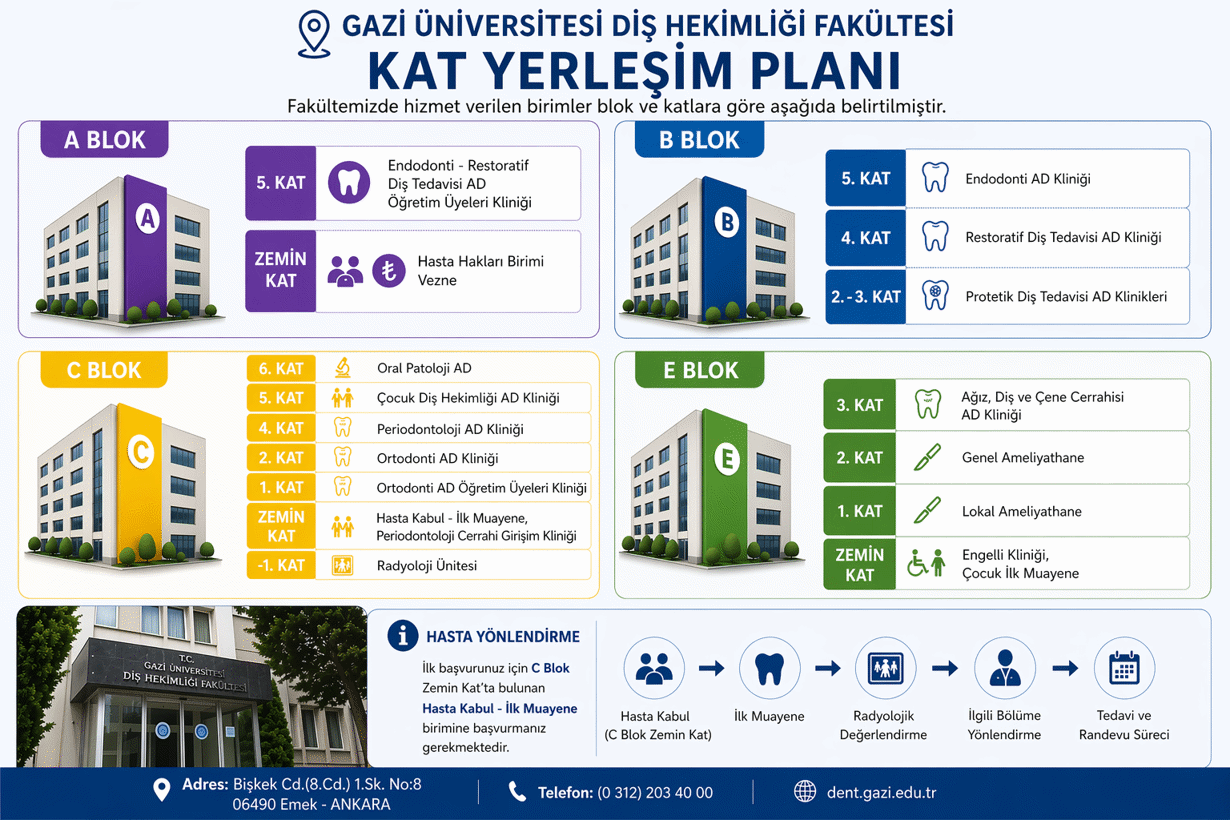 Gazi Üniversitesi Diş Hekimliği Fakültesi’ne başvuru, muayene süreci, hasta hakları, sevk işlemleri ve gerekli dokümanlara bu sayfadan kolayca ulaşabilirsiniz.